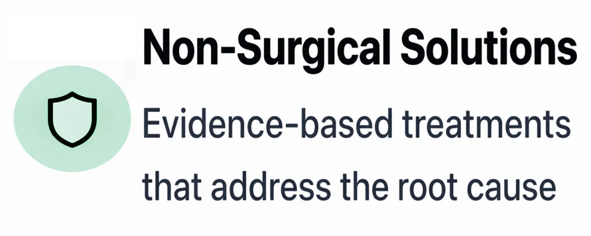 Our focus is on non-surgical treatment options. We specialize in evidence-based, minimally invasive approaches that help most patients avoid surgery altogether. We'll thoroughly evaluate your condition and only recommend surgical consultation if it's truly necessary for your well-being.